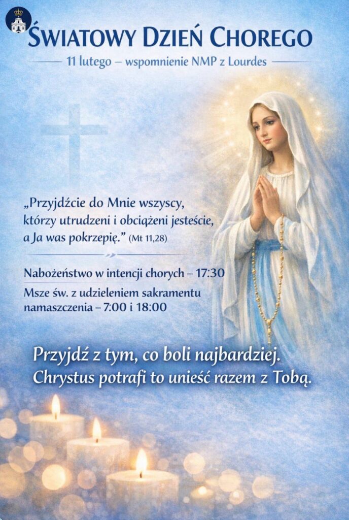 Wydarzenia Światowy Dzień Chorego – 11 lutego 2026-02-09 Zapraszamy do naszej parafii na modlitwę, która niesie pokój, nadzieję i umocnienie.