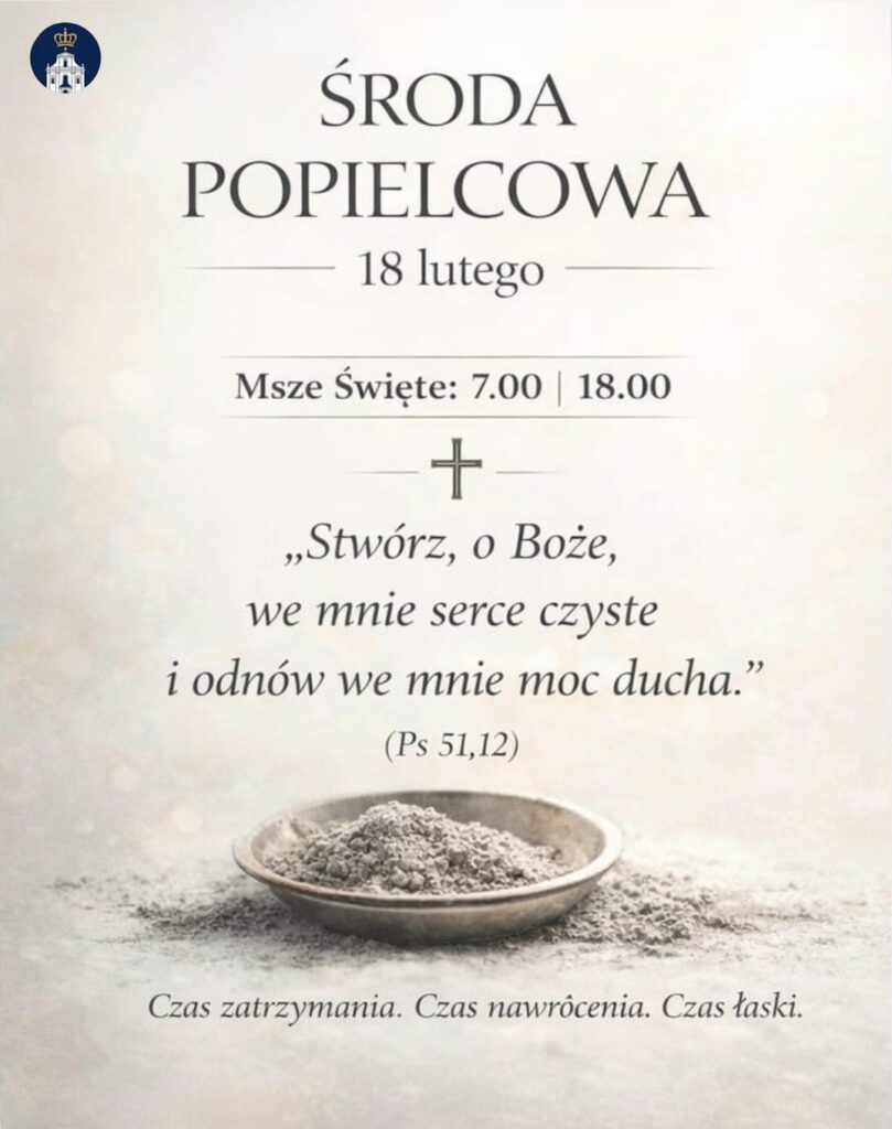 Dnia 18.02 przypada Środa Popielcowa, która rozpoczyna w Kościele okres Wielkiego Postu, czas modlitwy, pokuty i nawrócenia. W naszej parafii Msze Święte z obrzędem posypania głów popiołem odbędą się o godz. 7.00 oraz 18.00. Tego dnia obowiązuje post ścisły i wstrzemięźliwość od pokarmów mięsnych. Zachęcamy do licznego udziału w liturgii oraz podjęcia wielkopostnych postanowień.