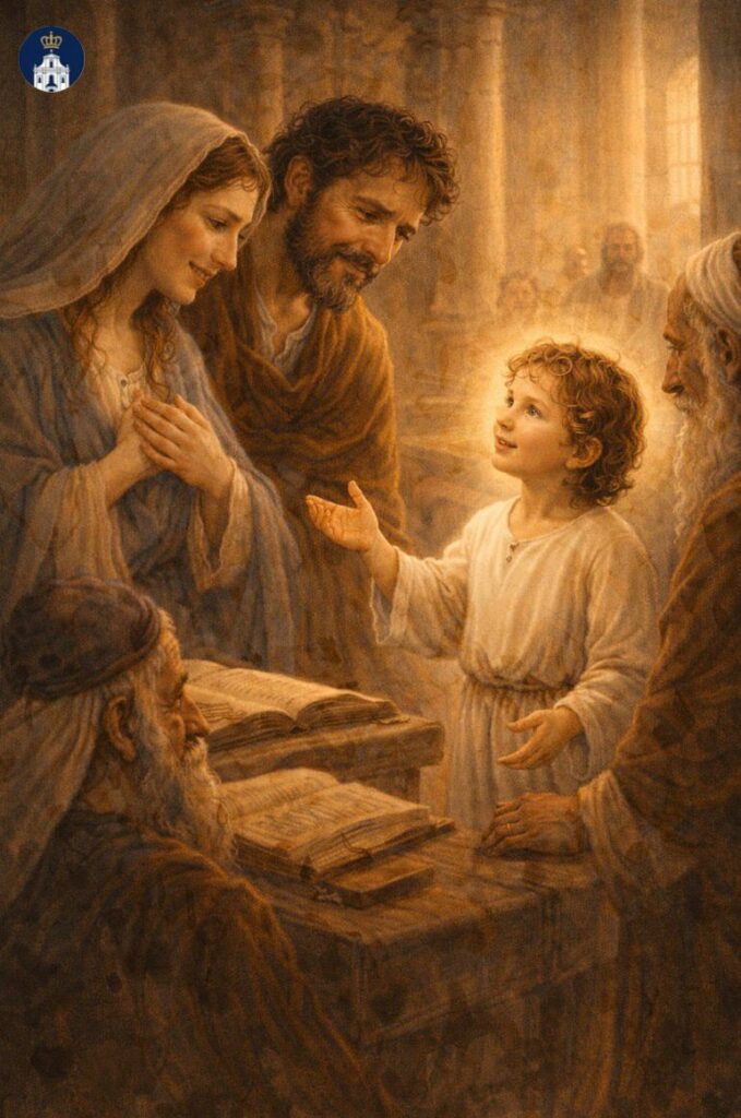 Z Ewangelii według św. Łukasza: Dopiero po trzech dniach odnaleźli Go w świątyni, gdzie siedział między nauczycielami, przysłuchiwał się im i zadawał pytania (Łk 2,46).