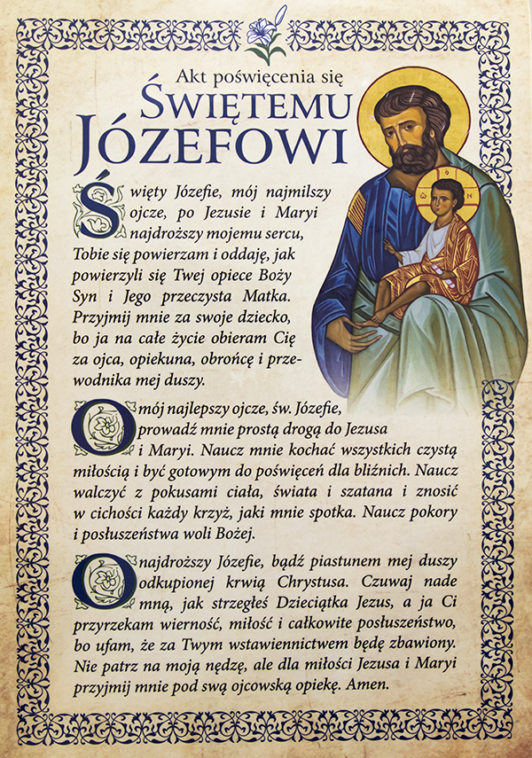 W uroczystość św. Józefa powierzamy Twojej ojcowskiej opiece całą naszą wspólnotę parafialną: nasze życie codzienne, troski i nadzieje. Prosimy, wypraszaj nam potrzebne łaski, umacniaj nas w wierze, ucz zaufania Bożej Opatrzności i prowadź drogą wierności, abyśmy wzrastali w miłości do Boga i bliźnich.