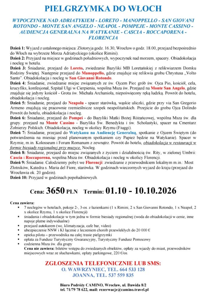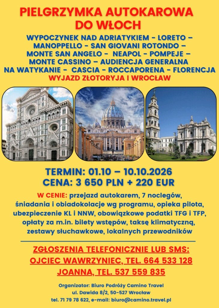Z radością zapraszamy Was na wyjątkową pielgrzymkę autokarową do Włoch.